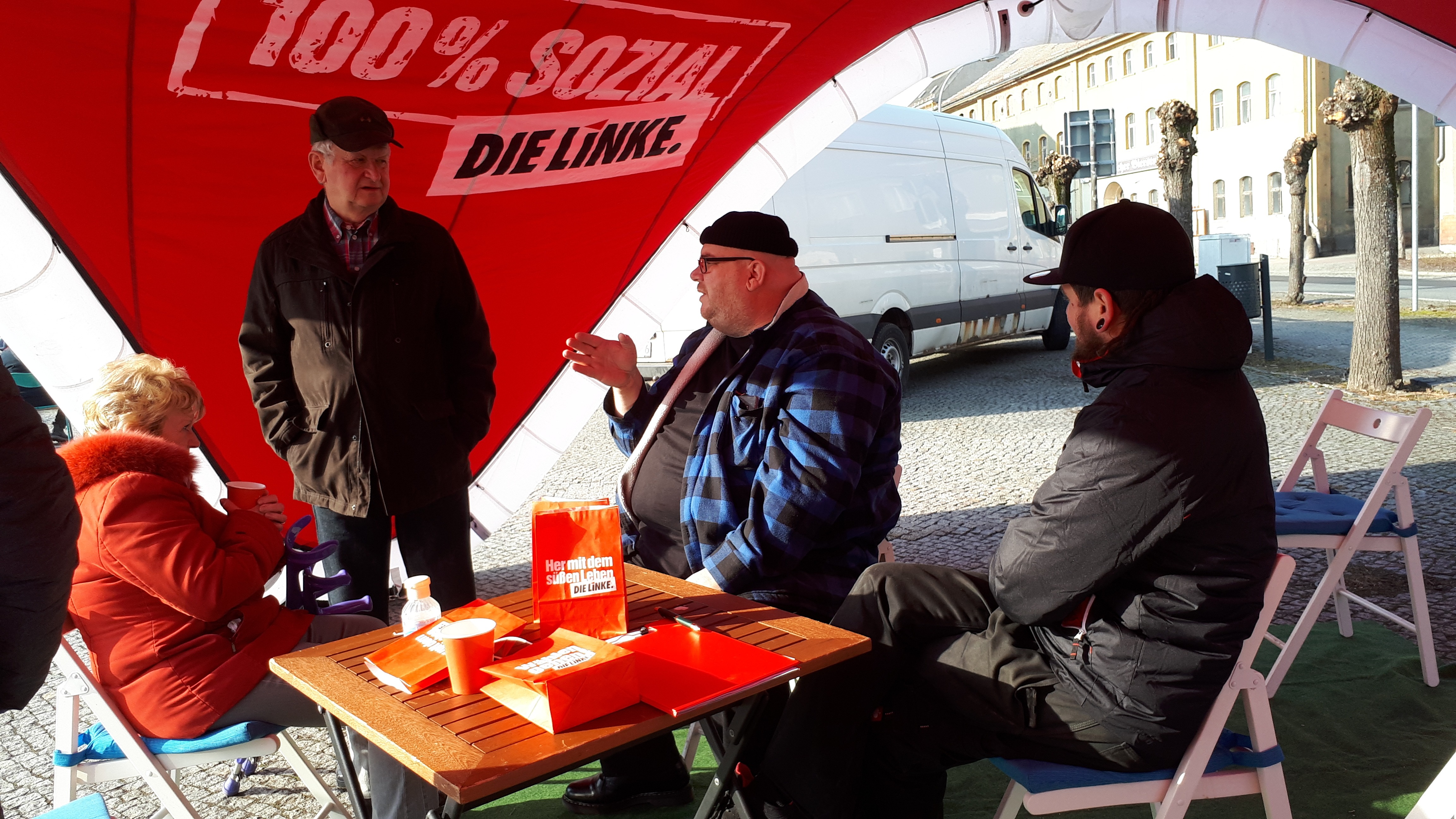 Der Landkreis Görlitz ist der Kreis mit der geringsten Kaufkraft und den meisten Ausgaben für Sozialpolitik. Welche Probleme im Einzelfall dahinter stecken, wollte ich mit den Direktkandidaten Antonia Mertsching und Tuomo Neumann in Erfahrung bringen. Deshalb waren wir im Landkreis unterwegs mit einem Pavillon unterwegs. Dieser war gut sichtbar und so wurde die Aktion auch von denen wahrgenommen, die nur an den Standorten vorbeifuhren. Bei Glühwein und anderen heißen Getränken konnten Bürger von Schleife bis Jonsdorf über Ärztemangel, über das ungenügende Bildungssystem, über Klimawandel, Vorstellung von neuen Strukturen, über nachhaltige Produktionen, über regionale Produkte, über Probleme der Vereine bis Zukunftsideen uns diskutieren. Die Genossen aus den Ortsverbänden unterstützten die Aktion und konnten auf spezifische regionale Fragen die kompetenten Antworten geben.
